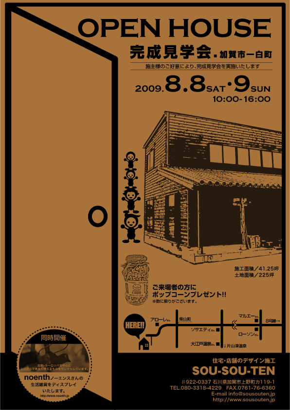 | 2009/8/5 8月8日と9日の2日間、SOU-SOU-TENさんの住宅完成会が開催されます。 この2日間、当店の生活雑貨などをディスプレイさせていただきます。 お近くの方は、ぜひ遊びにいらして下さい。 |