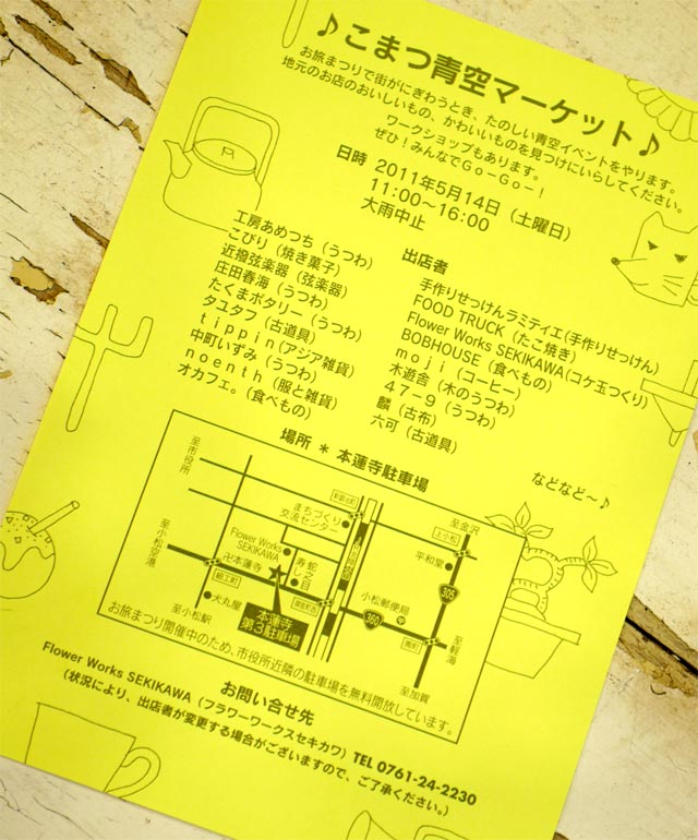 | □ 2011/5/13 明日5月14日(土)は、♪こまつ青空マーケット♪に出店するためお店はお休みいたします。 ぜひ青空マーケットにお越しください。 |