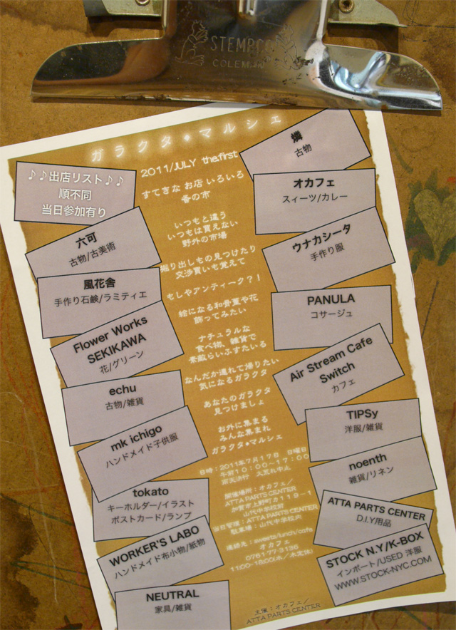 | □ 2011/7/16 明日7月17日(日)は、「ガラクタ・マルシェ」に出店するためお店はお休みいたします。 ぜひ「ガラクタ・マルシェ」にお越しください。 |