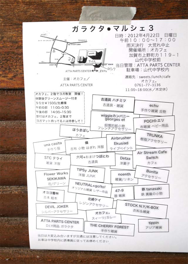 □ 2012/3/6 「ガラクタマルシェ」今年も参加いたします。 ぜひお越し下さい! −ガラクタ・マルシェ3 − 日時:2012年4月22日(日) 10:00〜17:00 場所:オカフェ&ATTA PARTS CENTER駐車場(山代中学校前) 駐車場:山代中学校内 お問い合わせ:オカフェ 0761-77-3136 雨天決行(大荒れの場合は中止) |