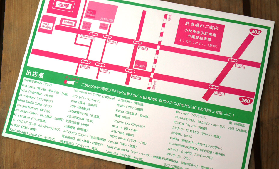 □ 2012/5/12 明日5月13日(日)は、イベント「こまつ青空マーケット」に出店するため、お店はお休みいたします。 ぜひイベント会場へ遊びに来てください。 −こまつ青空マーケット− 日時:5月13日(日曜日)10時〜16時 場所:本蓮寺駐車場(小松市細工町交差点横) お問い合わせ:FlowerWorks SEKIKAWA 0761-24-2230 お客様駐車場は会場横にご用意しております。 満車の場合は会場からも徒歩圏内の小松駅、小松市役所周辺市営駐車場が無料解放されておりますので、そちらもご利用ください。 |
